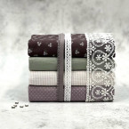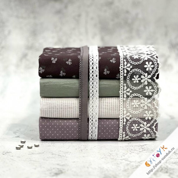 В наборе: - Твил с цветочками 48х50см - Вареный хлопок 50х65см - Тонкий хлопок в полосочку 35х50см - Трикотаж хлопковый 40х50см - Резиночка ажурная 1м - Хлопковое кружево (шириной 11мм) 2м - Кружево (шириной 45мм) 1м - Пуговки с жемчужинкой 6мм 5шт