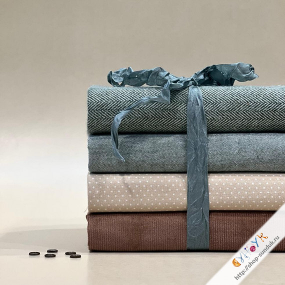 В наборе : - американская фланель в елочку 45х55см - хлопок меланж 50х60см - тонкий американский хлопок в точечку 50х55см - микровельвет Америка 35х50см - лента шелковая 1м - пуговки металлические на 4 прокола 6мм 5шт