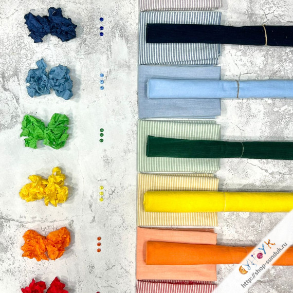 В наборе: - микровельвет Америка 35х50см 5шт - микровельвет Корея 35х50см 2шт - тонкий хлопок в полосочку 30х50см 5шт - аутентичный хлопок меланж 30х50см 2шт - шебби-ленты Америка 7шт - пуговки 6мм 21шт