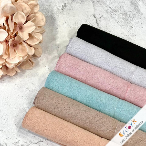 Трикотажное полотно, с имитацией замшевой фактуры на лицевой стороне. Ткань мягкая, обладает растяжимостью в одном направлении и практически не тянется в другом. Идеально подходит для изготовления тела текстильных игрушек., пошива верхней одежды для кукол.