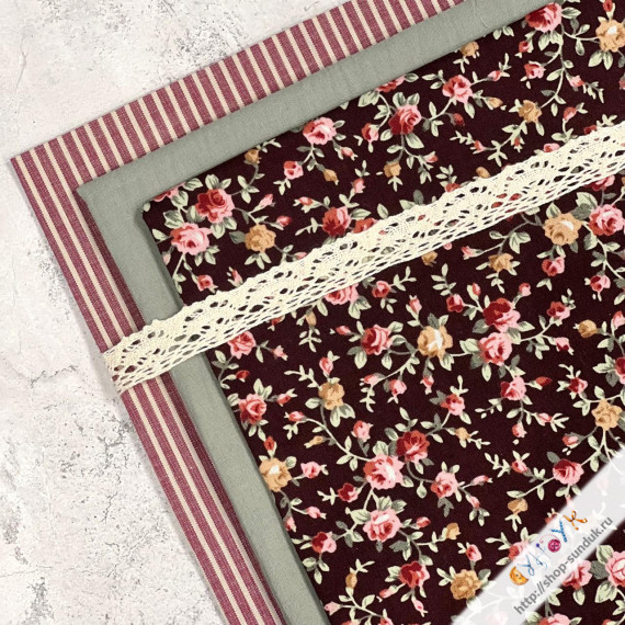 В наборе: - американский батист в полосочку 50х55см - вареный батист 50х60см - тонкий хлопок с цветочным принтом 50х70см - кружево хлопковое 13-14мм 1,5м