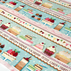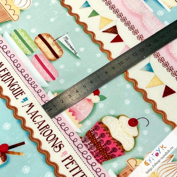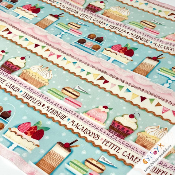 Размер отреза 60х110см Отрез включает в себя четыре полосы со сладостями высотой примерно 10см и длиной около 110см. Плотность 140±5г/м2 Состав 100% хлопок Америка. SPX Fabrics