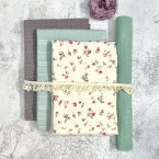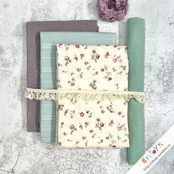 В наборе - муслин с цветочками 50х65см - батист open work мятный 50х65см - трикотаж хлопковый "пшено на сиреневом" 40х50см - микровельвет Корея 35х50см - шебби лента Америка 2м - хлопковое кружево на резинке 1м
