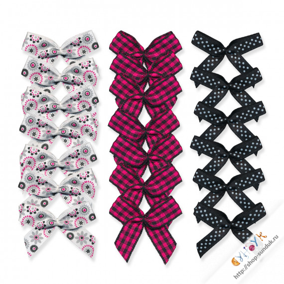 В наборе 20 бантиков: -14 штук из лент шириной 10 мм. - 6 штук из лент шириной 6 мм.