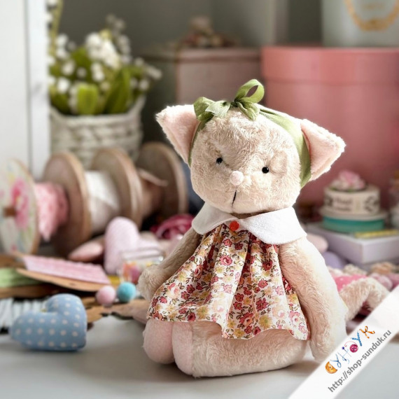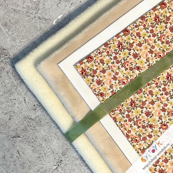 В наборе : - плюш для тельца 50х50см - флис 25х50см - хлопок белый 25х55см - хлопок с цветочным принтом 48х50см - лента 1м - глазки пришивные 1 пара - мулине розовое 1шт - бусинка 1шт