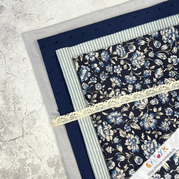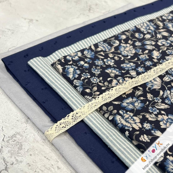 В наборе: - тонкий хлопок с цветочным принтом 50х75см - хлопок в полоску 50х60см - батист с мушками синий 50х65см - ажурный трикотаж 40х50см - тонкое хлопковое кружево 1,5м